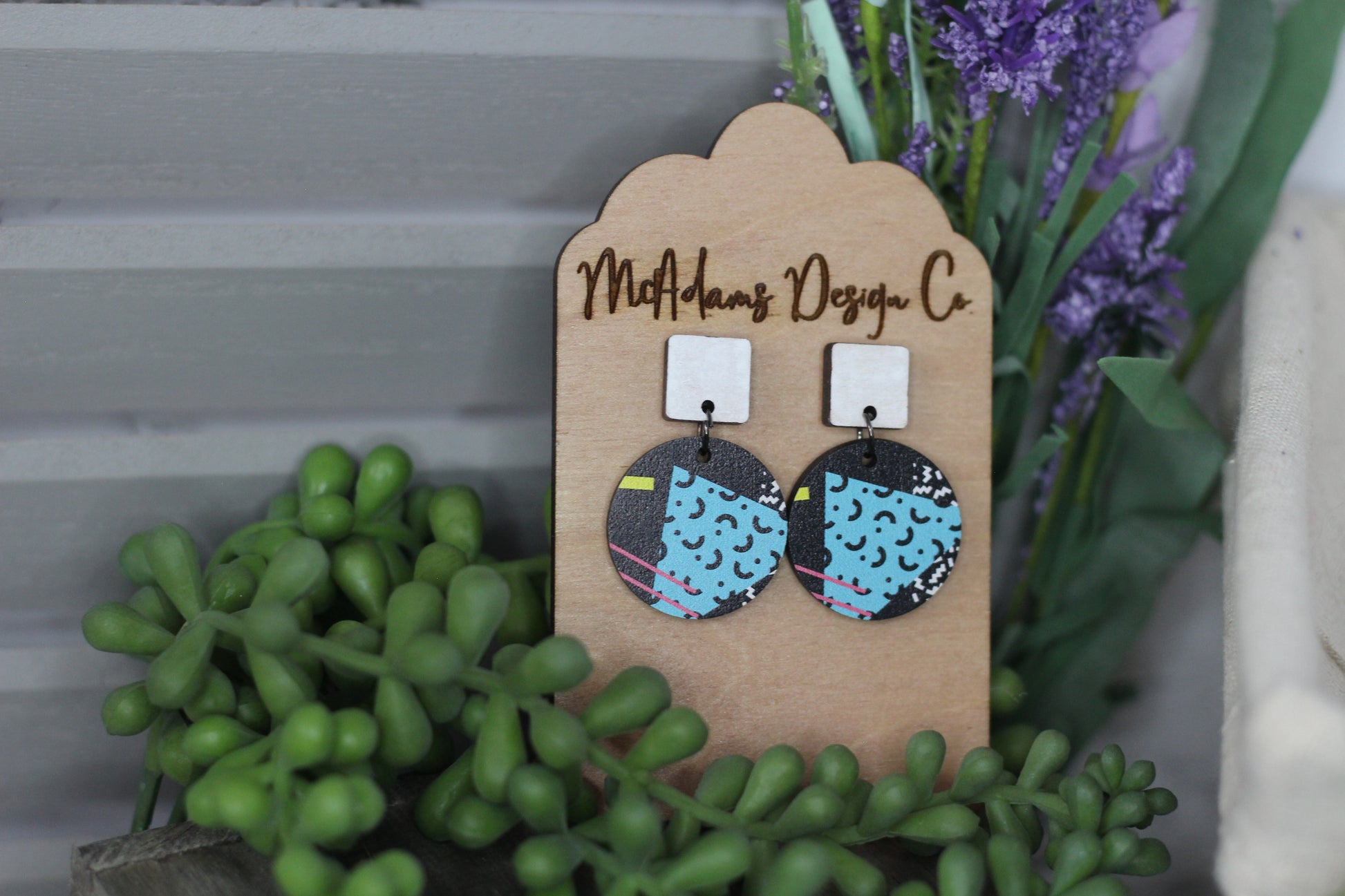 Hand-painted, laser-cut, wooden 90's theme earrings.