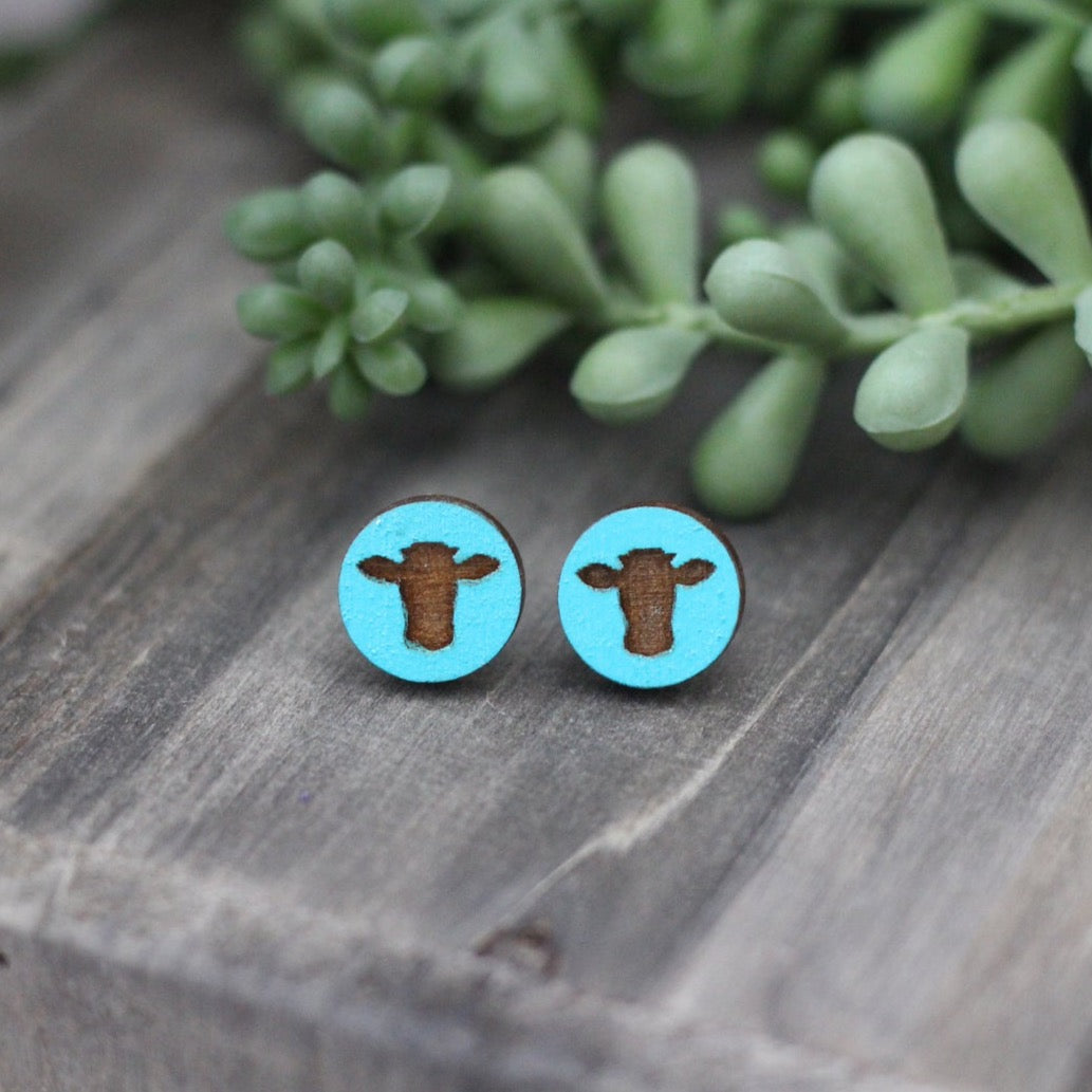 Hand-painted, laser-cut, wooden teal cow stud earrings.