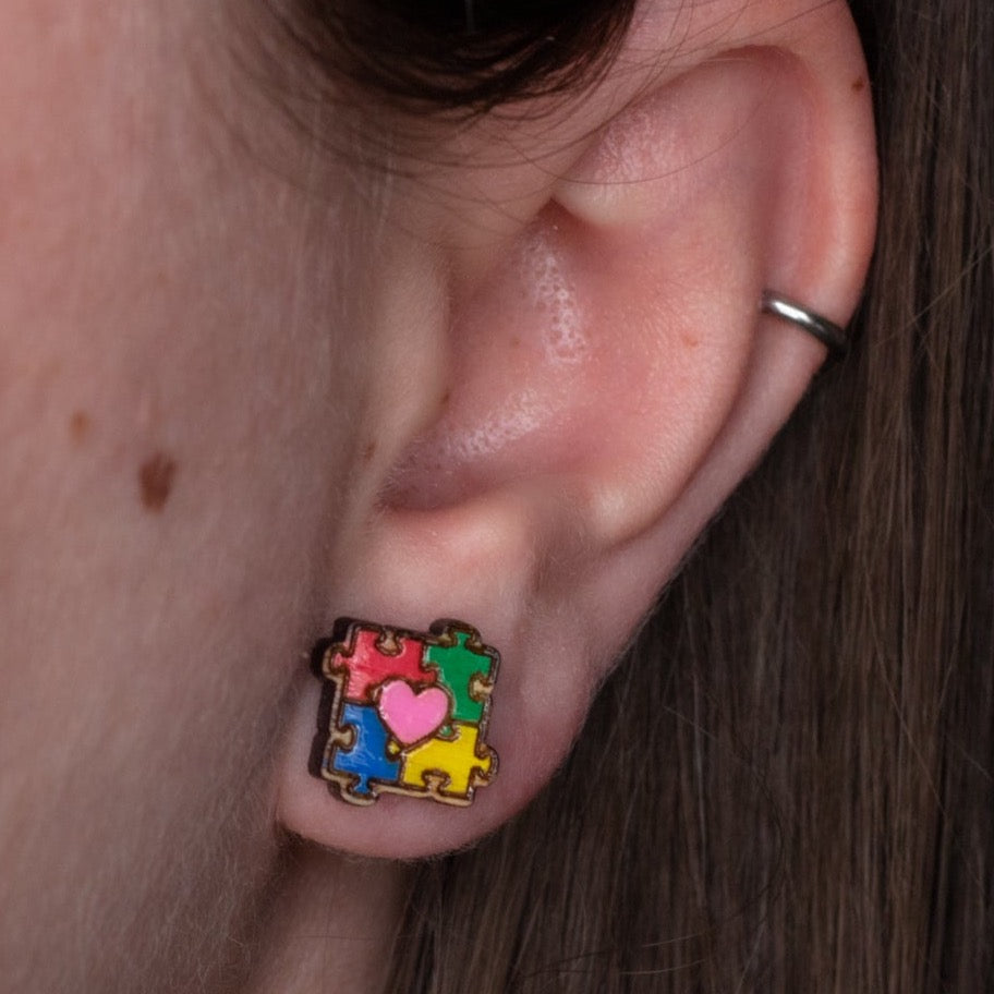 Hand-painted, laser-cut, wooden Autism Awareness stud earrings.
