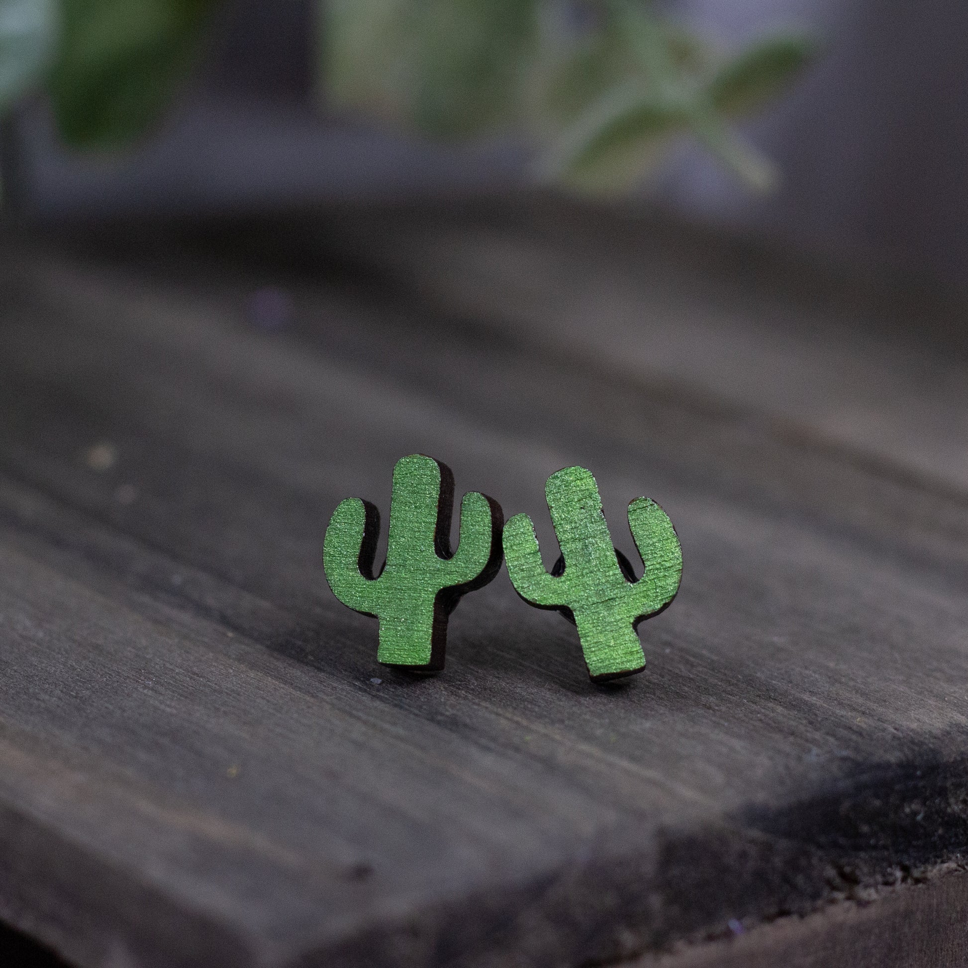 Hand-painted, laser-cut, wooden cactus stud earrings.