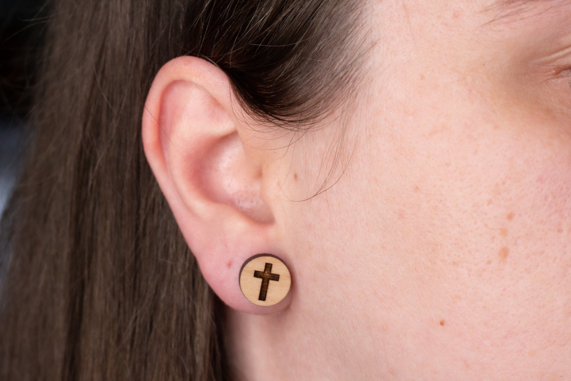 Hand-painted, laser-cut, wooden engrcross stud earrings.