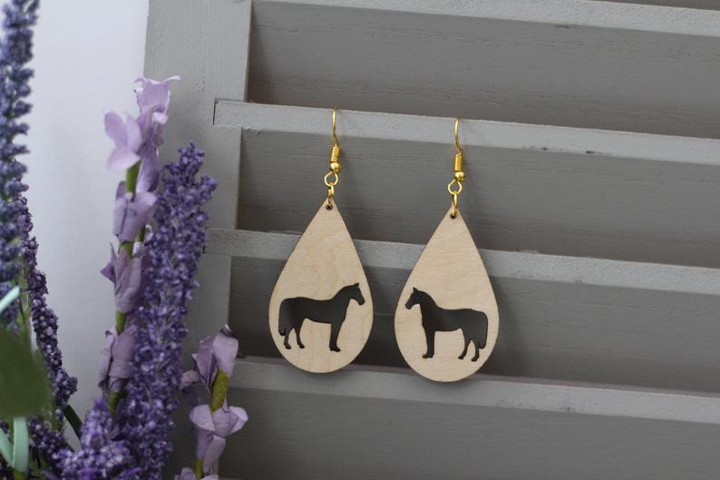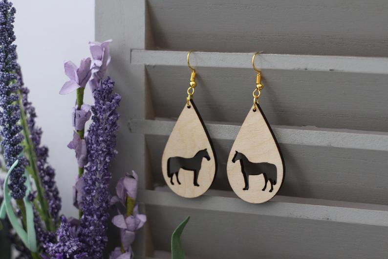 Hand-painted, laser-cut horse cutout wooden earrings.