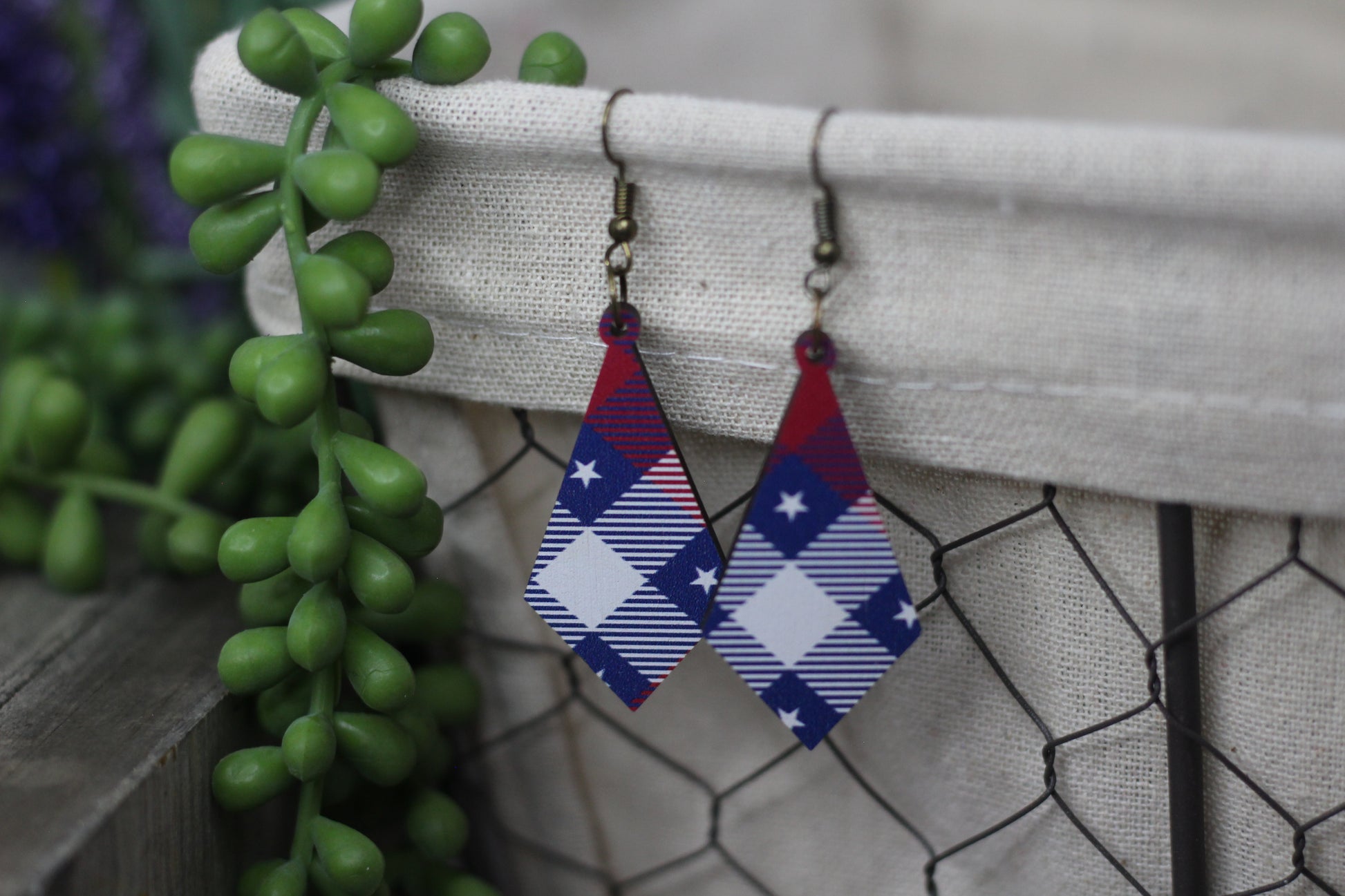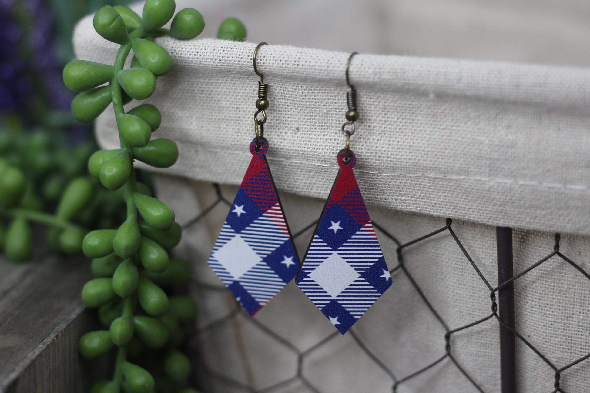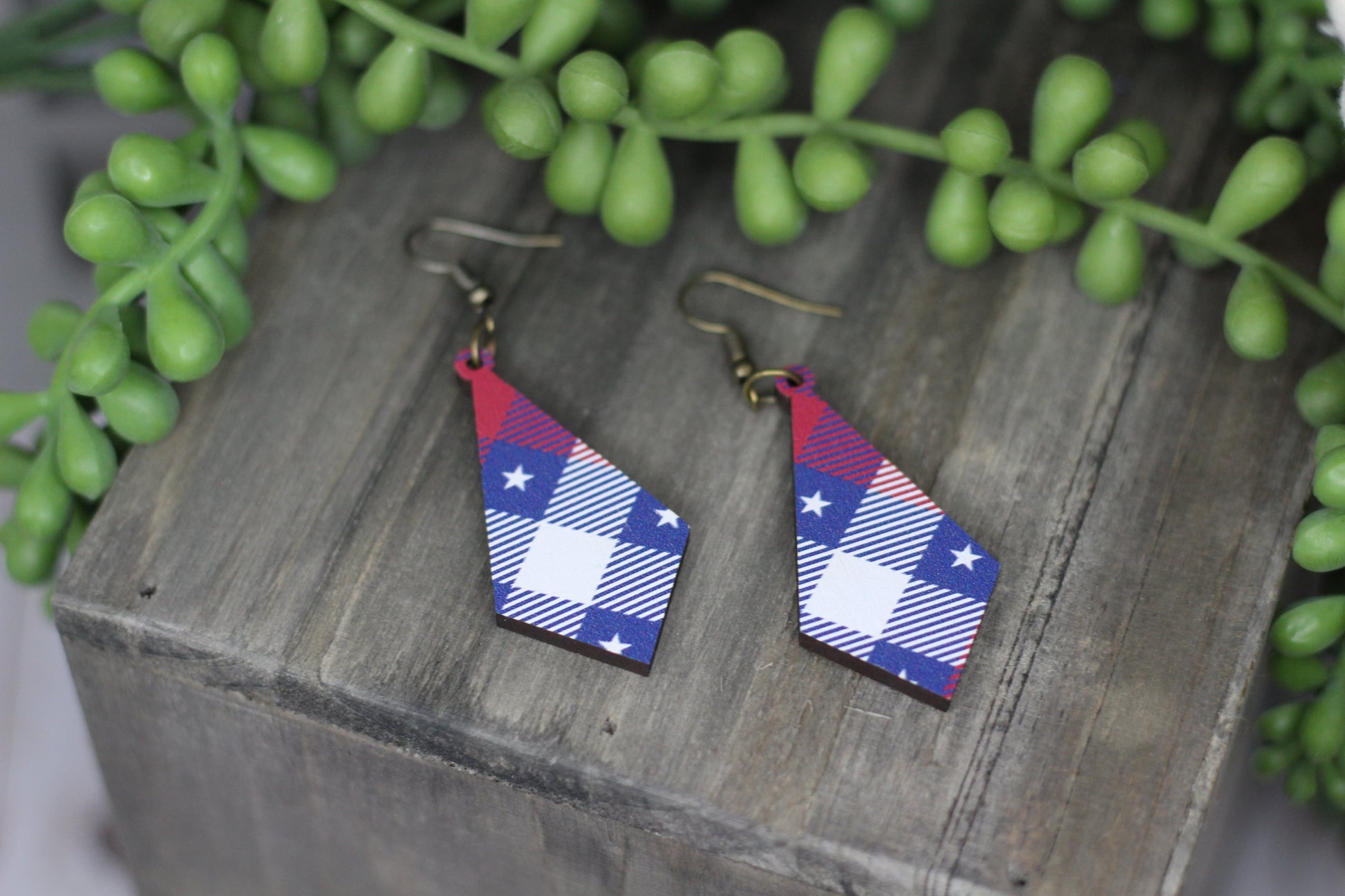 Laser-cut, 4th of July plaid printed wood stud earrings.