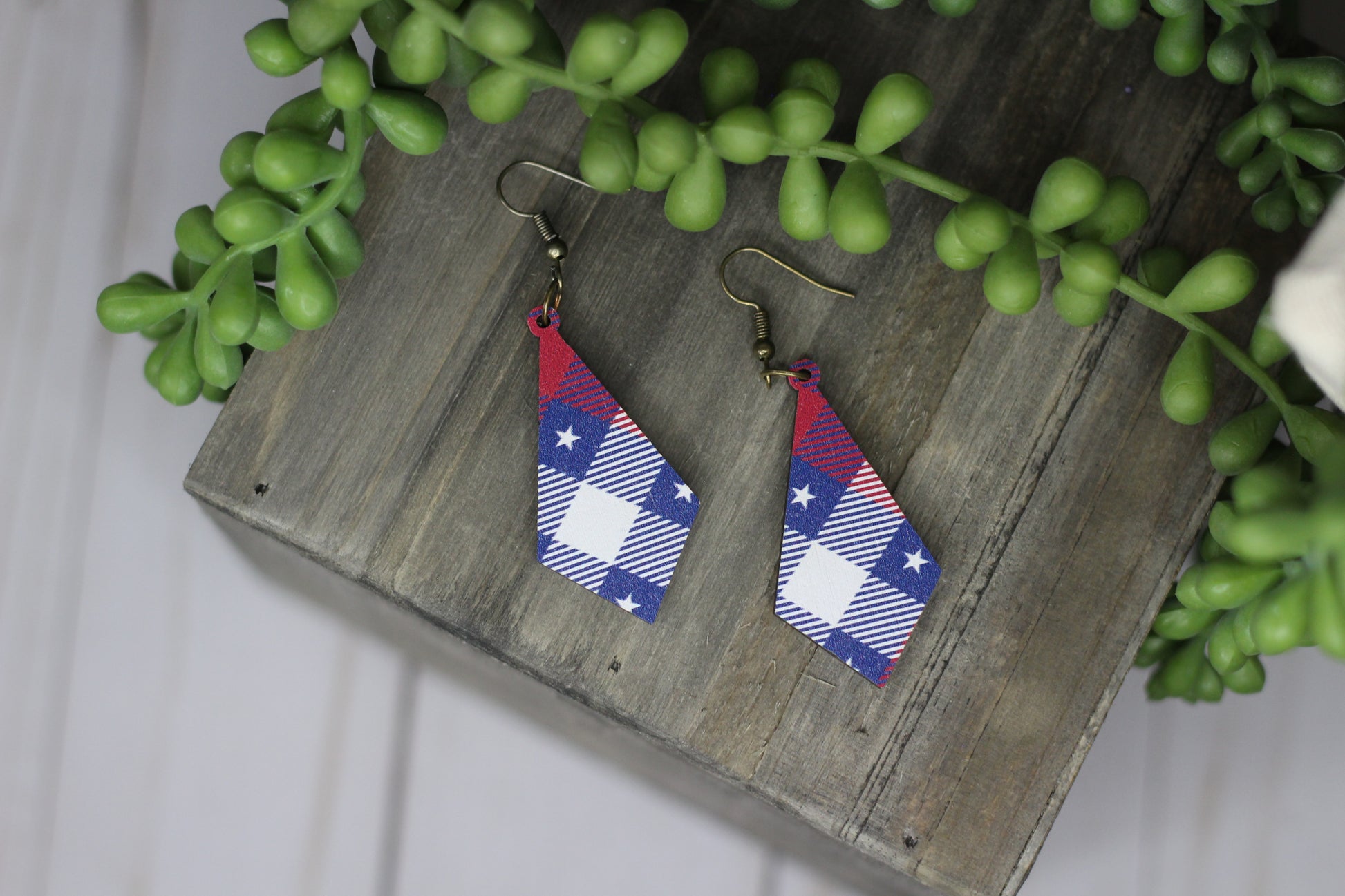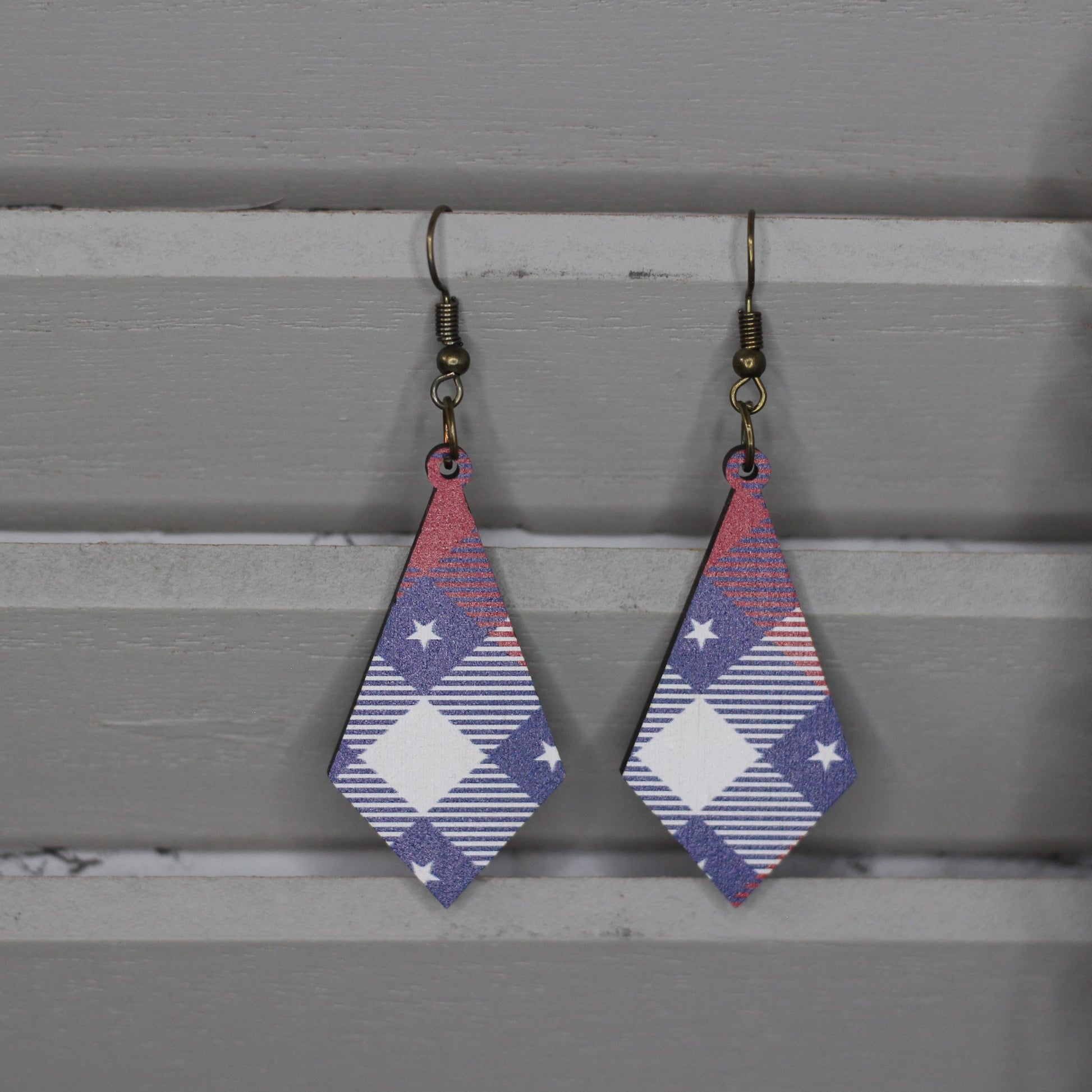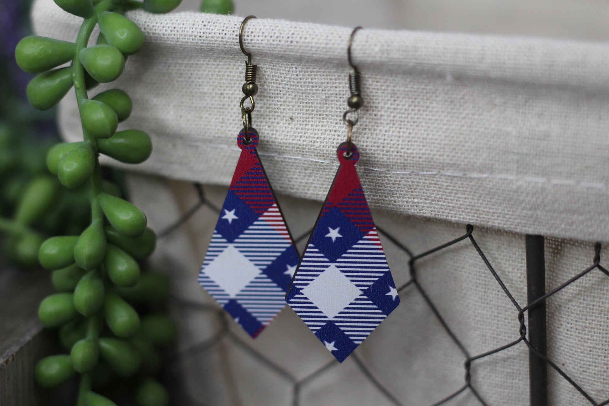 Laser-cut, 4th of July plaid printed wood stud earrings.